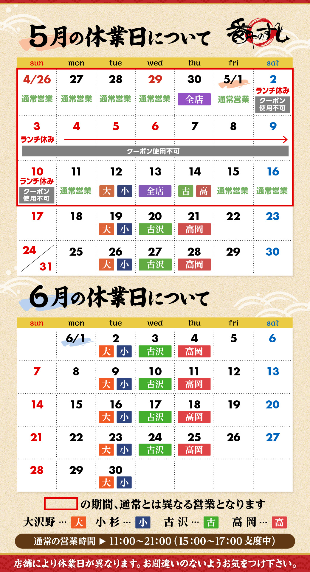 5月・6月の休業日について下記カレンダーをご参照下さい。
